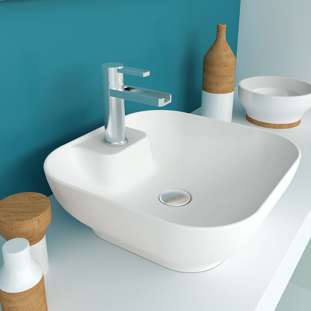 Olympia manufactures a series of sanitary ware of high design standards and high functional performance, for both domestic and professional use. Trend Square 01 is a square, modern, countertop, porcelain bathroom washbasin with a faucet hole. Upon selection, it can be accompanied by a universal, click-clack basin waste with ceramic top.