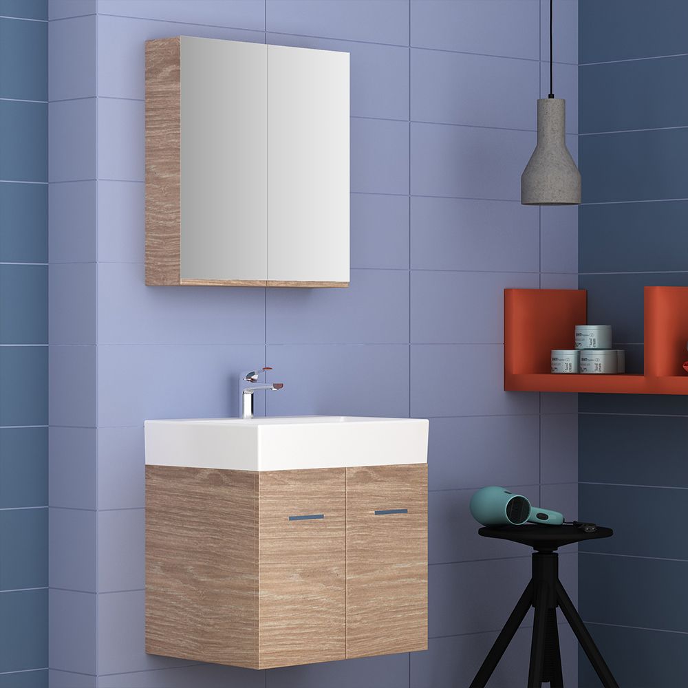 Κρεμαστό έπιπλο μπάνιου Amabile 60 – σειρά επίπλων Minimal. Ένα έπιπλο μπάνιου, βαρέως τύπου ιδανικό για οικιακή χρήση. Αποτελείται από, κρεμαστή βάση με δύο πόρτες με μηχανισμούς κλεισίματος soft close και νιπτήρα από πορσελάνη. Μπορείτε να ολοκληρώσετε την εικόνα του επίπλου προσθέτοντας καθρέπτη δικής σας επιλογής (ντουλάπι, εταζέρα με ντουλαπάκι ή καθρέπτη με πλαίσιο) και τα πόμολα που ταιριάζουν στο δικό σας μπάνιο. Όλα τα έπιπλα της εταιρείας Orabella μπορούν να πάρουν στήλες μπάνιου επιδαπέδιες ή κρεμαστές για επιπλέον χώρο αποθήκευσης, ενώ υπάρχει δυνατότητα προσθήκης ντουλαπιού πλυντηρίου σε χρώμα δικής σας επιλογής. Διατίθεται σε έξι διαφορετικές αποχρώσεις ξύλου και σε λευκό χρώμα-Laminate καθώς και σε μαύρο και λευκό γυαλιστερό και ματ ακρυλικό σε mdf. Κατόπιν επιλογής, μπορεί να συνοδευτεί με γραμμικό φωτιστικό μπάνιου Led.