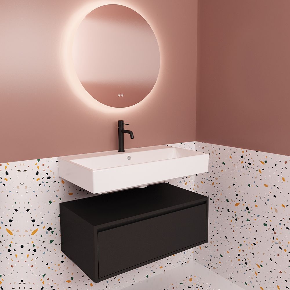 Κρεμαστό έπιπλο μπάνιου Drawer Amabile – σειρά επίπλων Drawer. Ένα έπιπλο μπάνιου, βαρέως τύπου ιδανικό για οικιακή χρήση. Αποτελείται από, κρεμαστή βάση με συρτάρι με μηχανισμό κλεισίματος soft close (Blum) και νιπτήρα από πορσελάνη. Διατίθεται σε τρείς διαστάσεις 60, 80 και 100 εκ. Μπορείτε να ολοκληρώσετε την εικόνα του επίπλου προσθέτοντας καθρέπτη δικής σας επιλογής (ντουλάπι, εταζέρα με ντουλαπάκι ή καθρέπτη με πλαίσιο ή καθρέπτη LED). Όλα τα έπιπλα της εταιρείας Orabella μπορούν να πάρουν στήλες μπάνιου επιδαπέδιες ή κρεμαστές για επιπλέον χώρο αποθήκευσης, ενώ υπάρχει δυνατότητα προσθήκης ντουλαπιού πλυντηρίου σε χρώμα δικής σας επιλογής. Διατίθεται σε έξι διαφορετικές αποχρώσεις ξύλου και σε λευκό χρώμα - Laminate καθώς και σε μαύρο και λευκό γυαλιστερό ή ματ mdf. Κατόπιν επιλογής, μπορεί να συνοδευτεί με γραμμικό φωτιστικό μπάνιου Led.