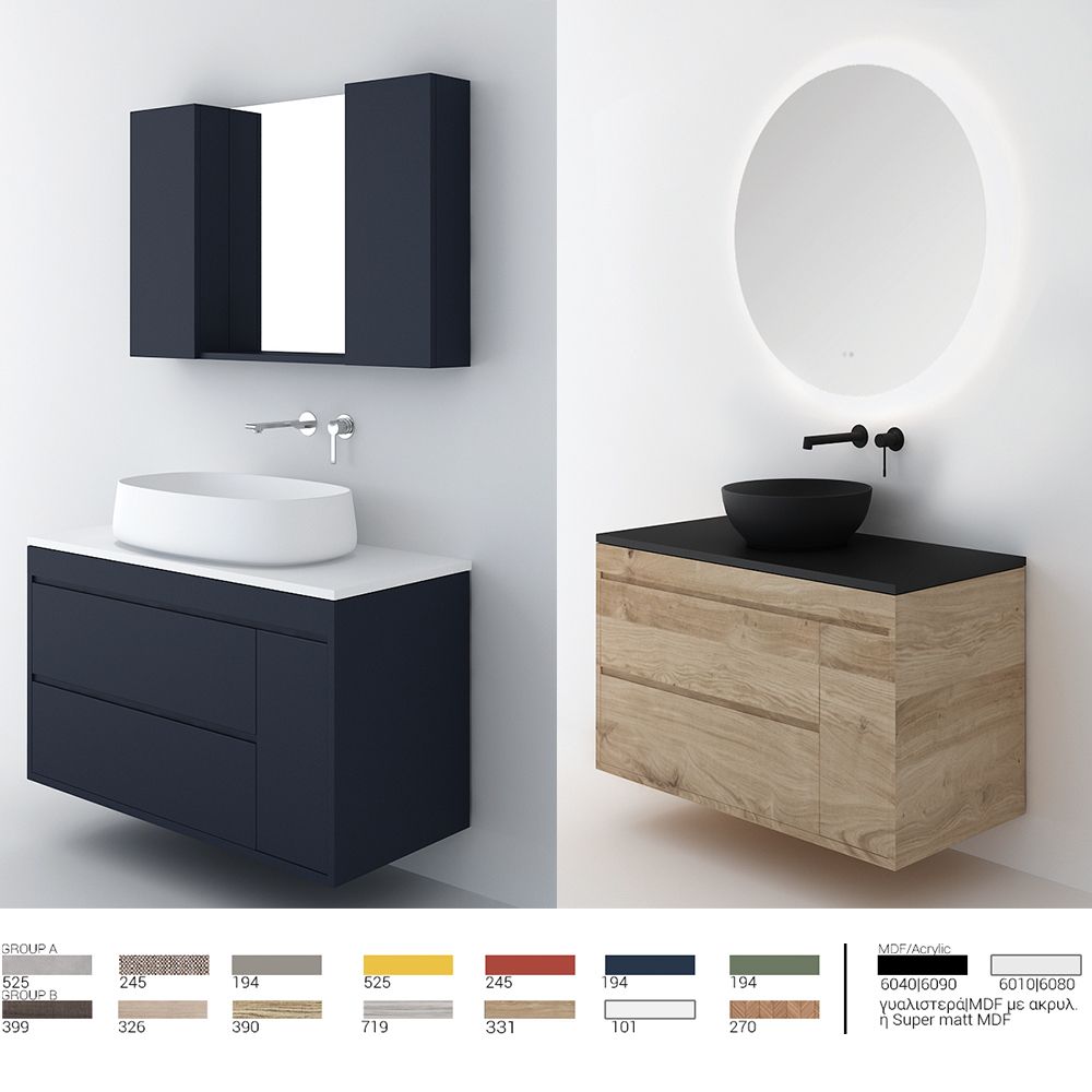 Υλικό επίπλου μελαμίνη με PVC ή MDF για μεγαλύτερη αντοχή στο χρόνο και σε μεγάλη γκάμα χρωματικών επιλογών. Χρήση μηχανισμών κλεισίματος soft close, που φέρουν την υπογραφή της κορυφαίας εταιρείας BLUM. Η συνολική σύνθεση του επίπλου αποστέλλεται συναρμολογημένη σε 2 τεμάχια και σε περίπτωση που επιλέξετε στήλες μπάνιου για να αυξήσετε τους αποθηκευτικούς χώρους στο μπάνιο σας, αυτές παραδίδονται, επίσης, συναρμολογημένες. Κατόπιν επιλογής, η σύνθεση μπορεί να συνοδευτεί με γραμμικό φωτιστικό μπάνιου Led 40 ή 60 εκατοστά ισχύος 8 και 12 watt αντιστοίχως, σε χρωμέ ή και μαύρο ματ χρώμα. Στην τιμή δεν συμπεριλαμβάνεται ο νιπτήρας, η μπαταρία και η βαλβίδα του νιπτήρα, μπορείτε να προσθέσετε ορειχάλκινη, βαλβίδα κλικ-κλακ για νιπτήρες με υπερχείλιση. Ομοίως μπορείτε να προσθέσετε μπαταρία νιπτήρος που φέρει την υπογραφή κορυφαίων εταιρειών στο σχεδιασμό ειδών υγιεινής, όπως Pentagono, Orabella by Armando Vicario και Orabella. Προσοχή: οι επικαλύψεις παραδίδονται ατρύπητες.