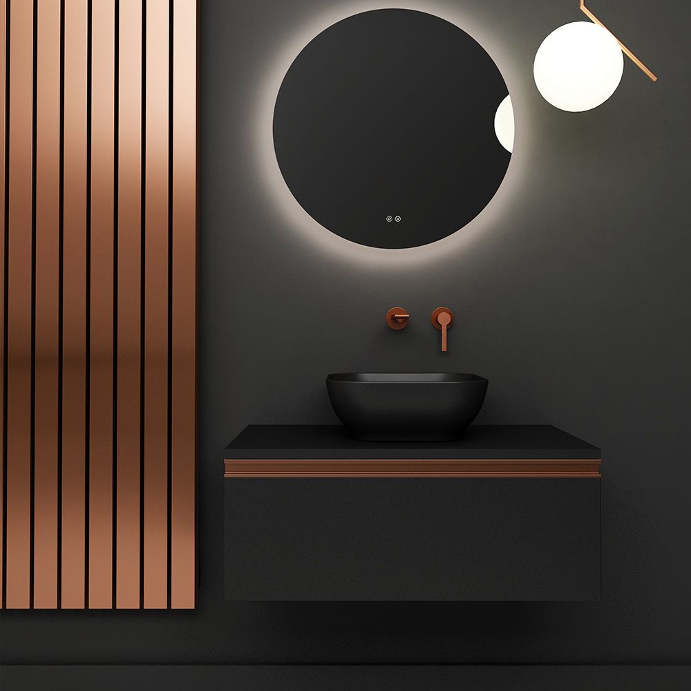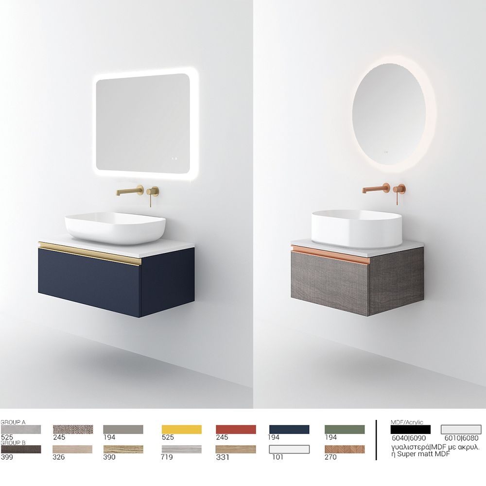 Υλικό επίπλου μελαμίνη με PVC ή MDF για μεγαλύτερη αντοχή στο χρόνο και σε μεγάλη γκάμα χρωματικών επιλογών. Χρήση μηχανισμών κλεισίματος soft close, που φέρουν την υπογραφή της κορυφαίας εταιρείας BLUM. Η συνολική σύνθεση του επίπλου αποστέλλεται συναρμολογημένη σε 2 τεμάχια και σε περίπτωση που επιλέξετε στήλες μπάνιου για να αυξήσετε τους αποθηκευτικούς χώρους στο μπάνιο σας, αυτές παραδίδονται, επίσης, συναρμολογημένες. Κατόπιν επιλογής, η σύνθεση μπορεί να συνοδευτεί με γραμμικό φωτιστικό μπάνιου Led 40 ή 60 εκατοστά ισχύος 8 και 12 watt αντιστοίχως, σε χρωμέ ή και μαύρο ματ χρώμα. Στην τιμή δεν συμπεριλαμβάνεται ο νιπτήρας, η μπαταρία και η βαλβίδα του νιπτήρα, μπορείτε να προσθέσετε ορειχάλκινη, βαλβίδα κλικ-κλακ για νιπτήρες με υπερχείλιση. Ομοίως μπορείτε να προσθέσετε μπαταρία νιπτήρος που φέρει την υπογραφή κορυφαίων εταιρειών στο σχεδιασμό ειδών υγιεινής, όπως Pentagono, Orabella by Armando Vicario και Orabella. Προσοχή: οι επικαλύψεις παραδίδονται ατρύπητες.