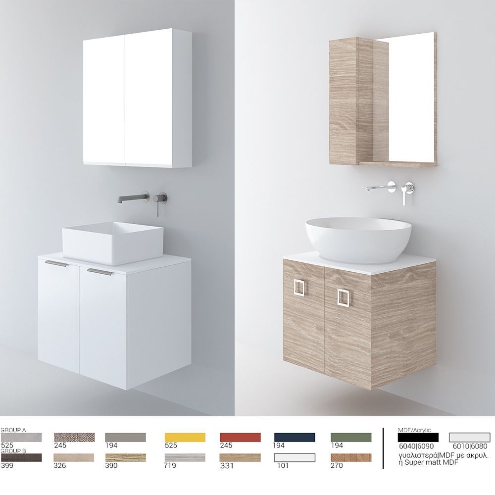 Υλικό επίπλου μελαμίνη με PVC ή MDF για μεγαλύτερη αντοχή στο χρόνο και σε μεγάλη γκάμα χρωματικών επιλογών. Χρήση μηχανισμών κλεισίματος soft close και blumotion (σε συρτάρια) που φέρουν την υπογραφή της κορυφαίας εταιρείας BLUM. Συμπεριλαμβάνονται στη βάση χρωμέ λαβές επίπλων, δικής σας επιλογής σε τρία σχέδια, ανάλογα με τη μορφολογία της βάσης. Ενώ υπάρχει δυνατότητα προσθήκης στο πακέτο μαύρων ματ γραμμικών λαβών, κατόπιν επιλογής. Στην περίπτωση τεσσάρων συρταριών ή μιας πόρτας και δύο συρταριών μπορείτε να επιλέξετε ανάμεσα στα πόμολα Μ1, Μ4 ή Μ5 ή σε μαύρο πόμολο M1. Σε βάση με δύο πόρτες μπορεί να τοποθετηθούν πόμολα χρωμέ, γραμμικά, L1, L2 ή L3 ή μαύρο ματ L1. Και τέλος στην περίπτωση βάσης με δύο πόρτες – δύο συρτάρια τα πόμολα σε χρωμέ απόχρωση είναι φιξαρισμένα, γραμμικά (S1,M1) αλλά μπορείτε να αλλάξετε την εικόνα του επίπλου σας προσθέτοντας μαύρα ματ πόμολα (S1,M1) ή μπορείτε να προσθέσετε σε όλες τις μορφολογίες του επίπλου minimal γραμμικά πόμολα (BL or BN). Ομοίως μπορείτε να συνδυάσετε φωτιστικό επίπλου σε χρωμέ ή μαύρη απόχρωση. Η συνολική σύνθεση του επίπλου αποστέλλεται συναρμολογημένη σε 3 τεμάχια (βάση, νιπτήρας και καθρέπτης) και σε περίπτωση που επιλέξετε στήλες μπάνιου για να αυξήσετε τους αποθηκευτικούς χώρους στο μπάνιο σας, αυτές παραδίδονται συναρμολογημένες. Κατόπιν επιλογής, η σύνθεση μπορεί να συνοδευτεί με γραμμικό φωτιστικό μπάνιου Led 40 ή 60 εκατοστά ισχύος 8 και 12 watt αντιστοίχως, σε χρωμέ ή και μαύρο ματ χρώμα. Στην τιμή δεν συμπεριλαμβάνεται ο νιπτήρας, η μπαταρία και η βαλβίδα του νιπτήρα, μπορείτε να προσθέσετε επικαθήμενο νιπτήρα και ορειχάλκινη βαλβίδα κλικ-κλακ για νιπτήρες χωρίς υπερχείλιση. Ομοίως μπορείτε να προσθέσετε μπαταρία νιπτήρος που φέρει την υπογραφή κορυφαίων εταιρειών στο σχεδιασμό ειδών υγιεινής, όπως Pentagono, Orabella by Armando Vicario και Orabella. Προσοχή: οι επικαλύψεις παραδίδονται ατρύπητες.